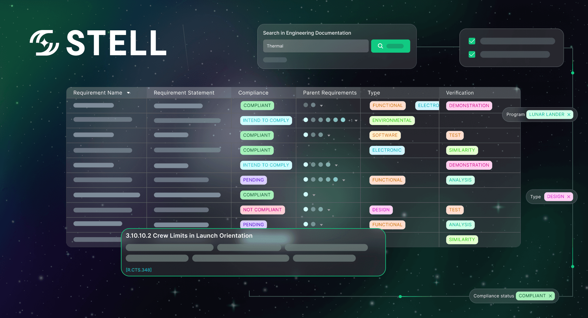 Stell is uniquely postured to streamline compliance management for heavily regulated defense and engineering industries. Stell’s tools unify traceability, verification, and document control under a single, cyber-compliant platform designed in the United States for teams requiring secure and reliable tools. Because requirements management is important to every stage of development, Stell empowers teams to achieve flawless compliance with intelligent automation and secure, collaborative tools.