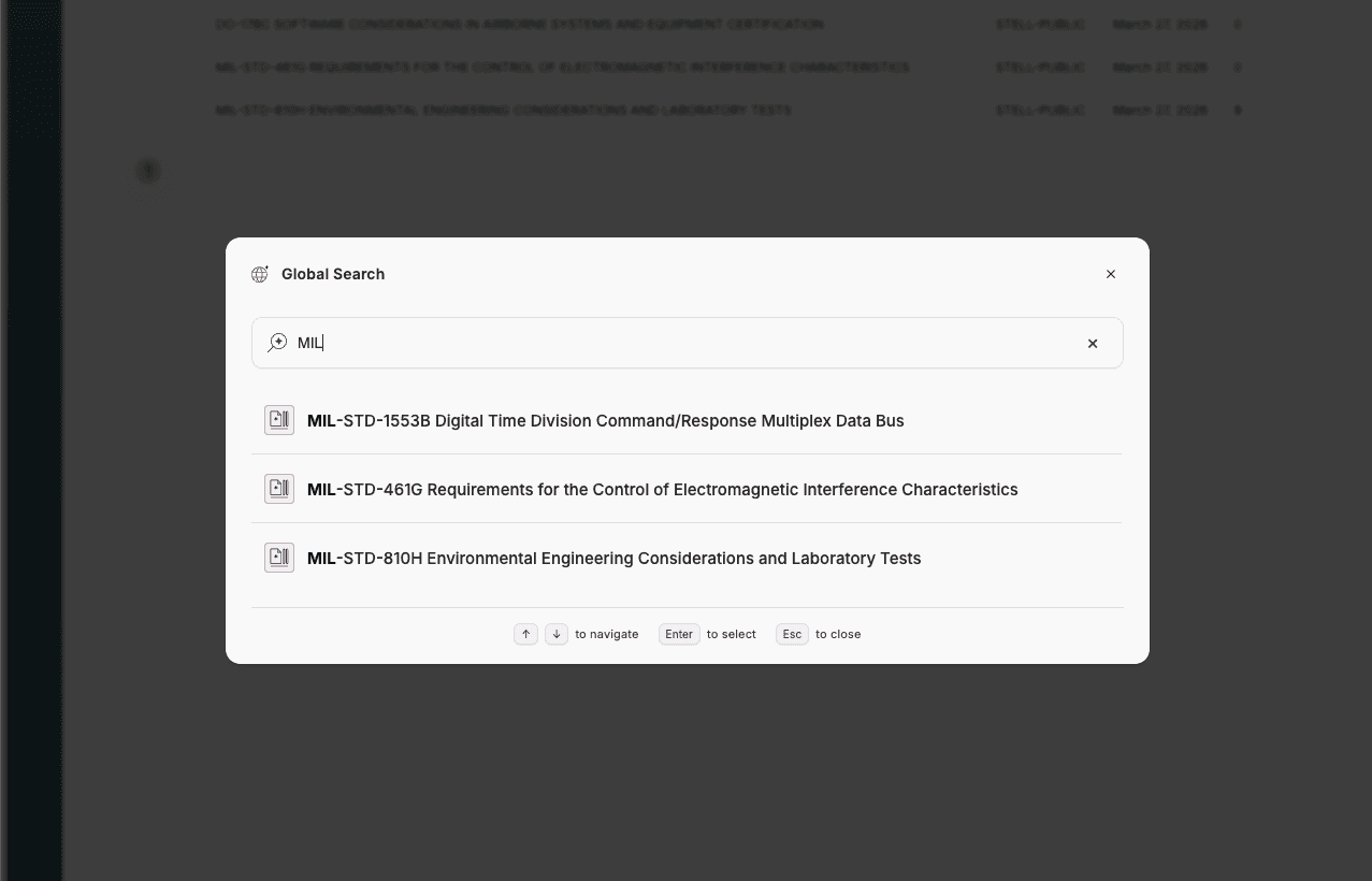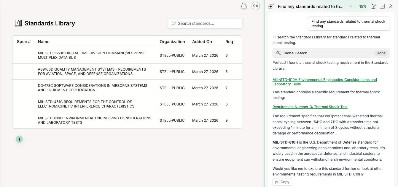 That’s why we built the Stell Standards Library, a shared repository of commonly-referenced aerospace and engineering standards available to all Stell users. These standards are uploaded by the Stell team, using the same import algorithm available across all of Stell, so our users can immediately interact with them via Zelda, Stell’s AI agent, move them into any programs they’re working on, and instantly create traceability links to a particular specification.