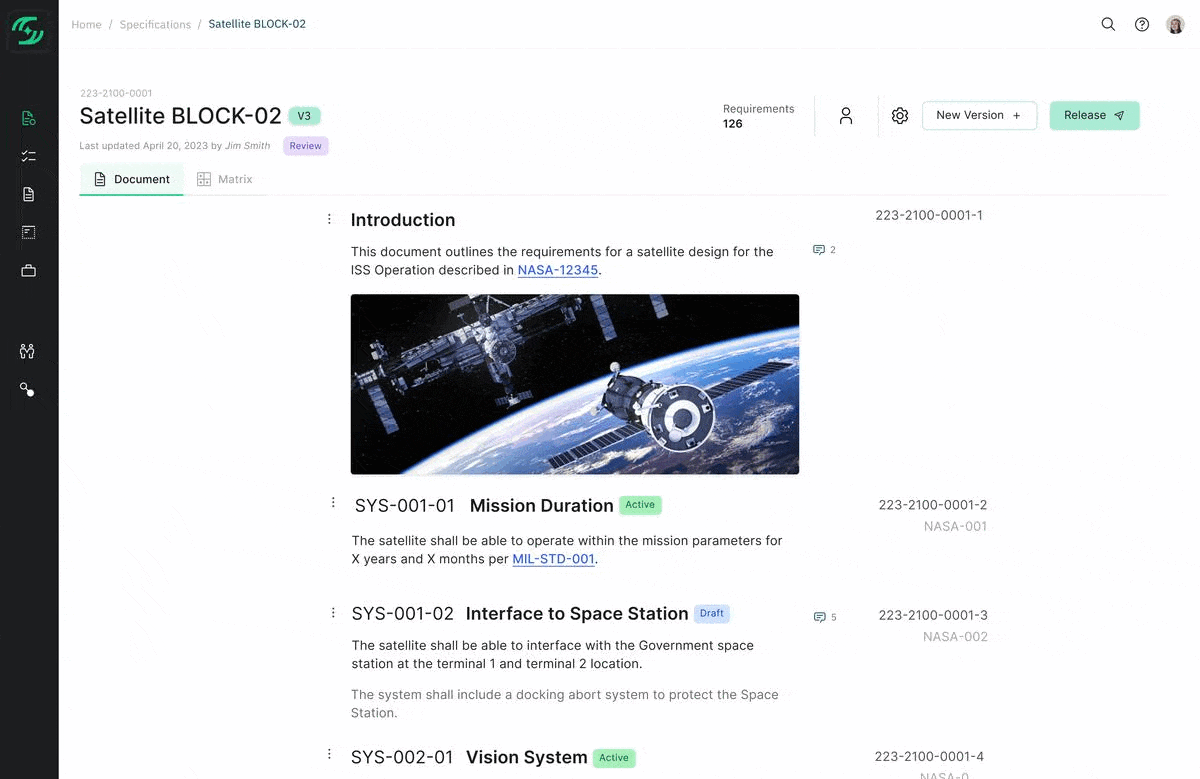 take action on your requirements - link to parent and child requirements across documents, attach verification artifacts, and track detailed metadata